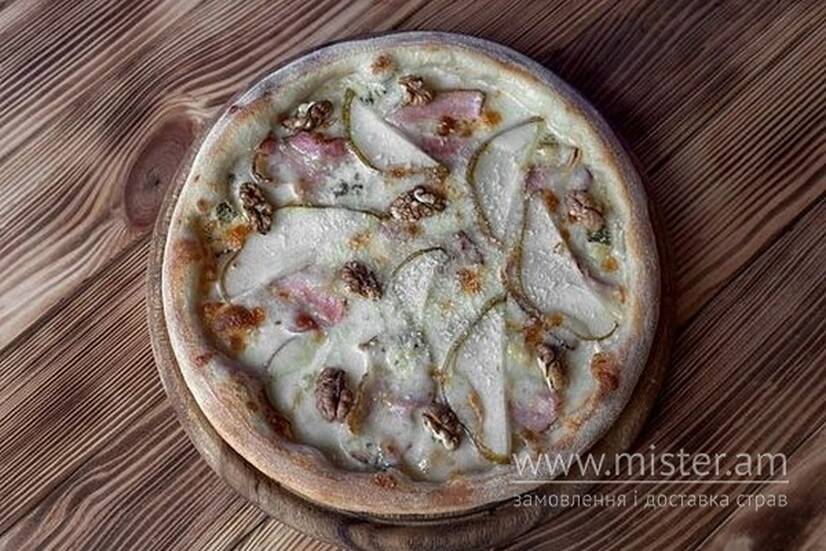 Соус "Бешамель", моцарела, бекон, карамелізована груша, дор-блю, пармезан, грецький горіх.