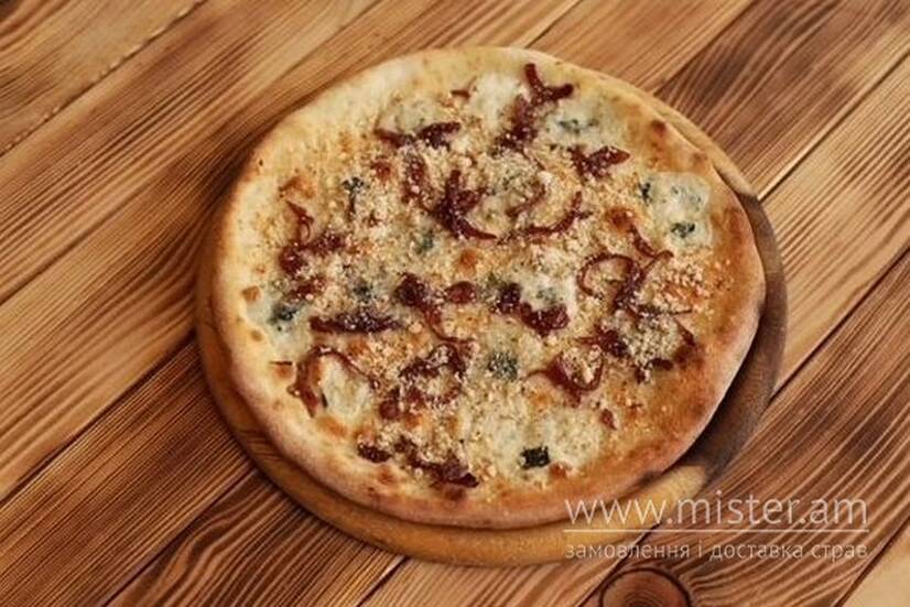 Тісто, часникова паста, сир дор блю, цибуля карамелізована, горіх волоський, сир пармезан.