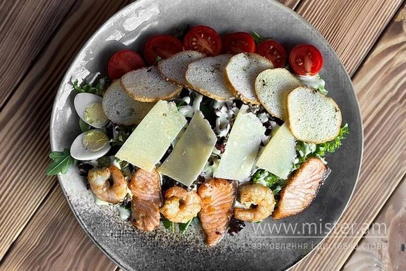 Лосось, креветки, помідор, лист салату, сир фета, фірмовий соус.