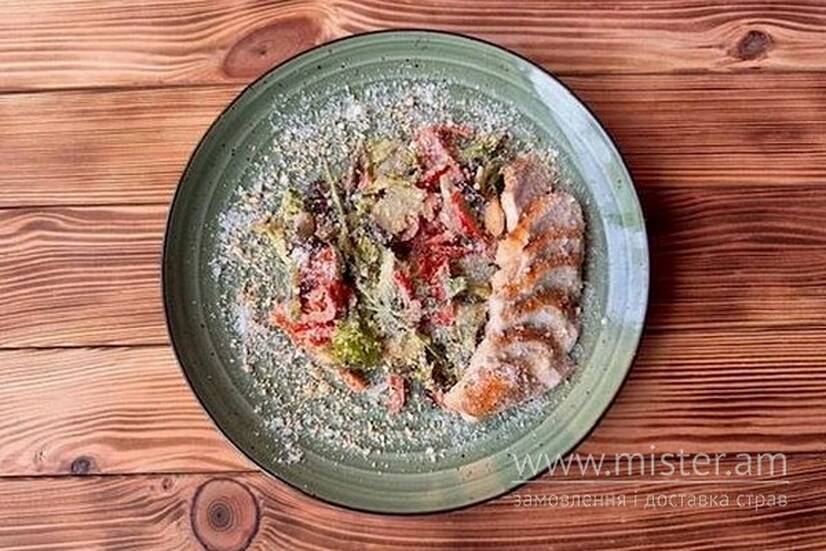 Курка печена, помідор чері, перець болгарський, лист салату, горіх фундук, сир пармезан, соус Філадельфія.