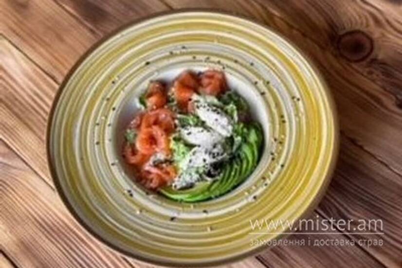 Лосось с/с, помідор чері, рукола, авокадо, сир Філадельфія, соус Філадельфія.