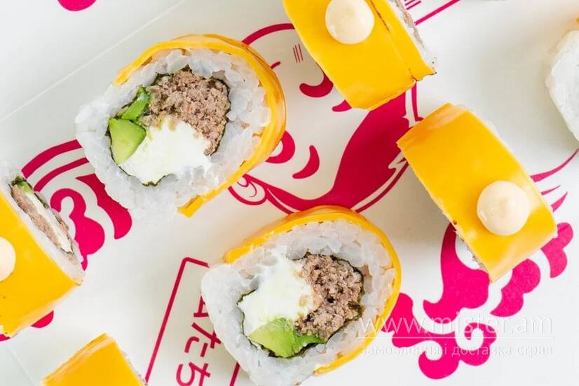 Рис, норі, тунець у власному соку, крем-сир, авокадо, сир чедер, спайсі соус.