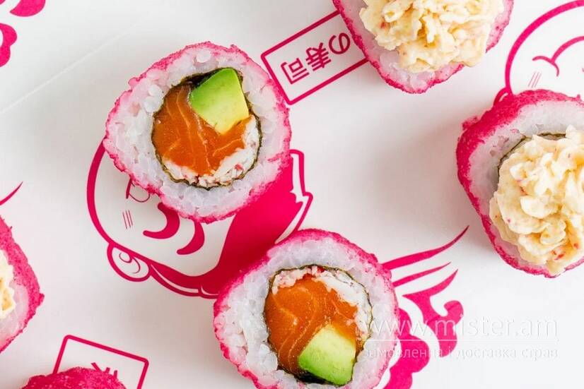 Рис, норі, лосось, авокадо, сніжний краб, крабовий крем-сир, рожева паніровка.