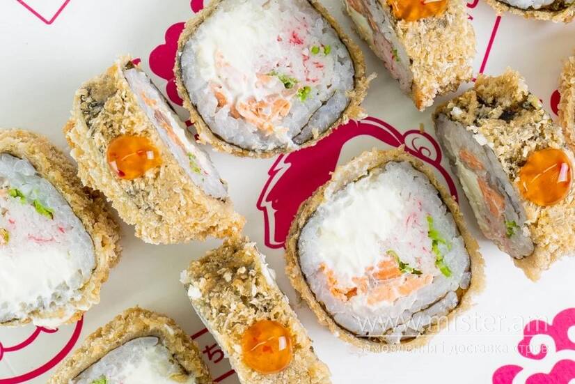 Рис, норі, крем-сир, лосось, цибуля порей, сніжний краб, соус солодкий чілі.