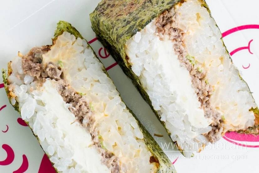Рис, норі, паніровка фурікакі, тунець у власному соку, крем-сир, цибуля порей, соус спайсі.