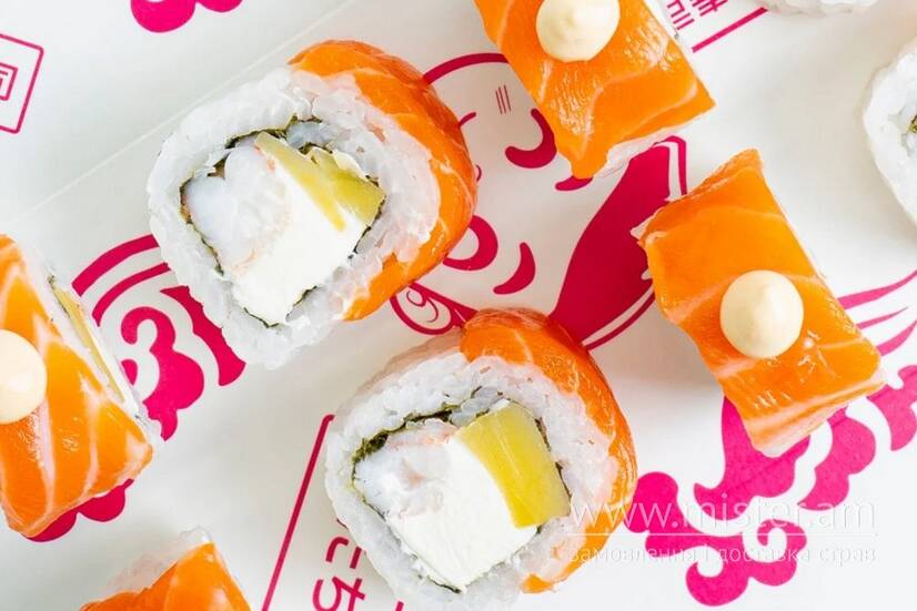 Рис, норі, лосось, креветка, крем-сир, манго, соус спайсі.