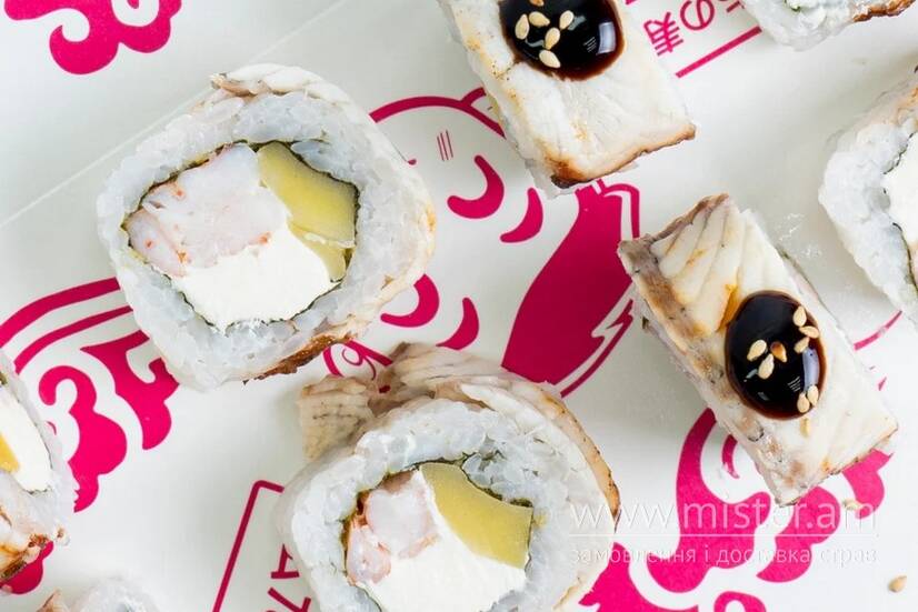 Рис, норі, вугор, креветка, крем-сир, манго, соус унагі кунжут.