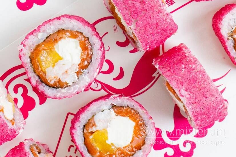 Рис, норі, лосось, крем-сир, манго, креветка, рожева паніровка.