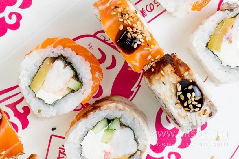 Рол, норі, лосось, вугор, креветка, манго, крем-сир, огірок, соус унагі, кунжут.