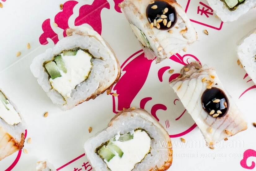 Рис, норі, вугор, крем-сир, огірок, соус унагі, кунжут.