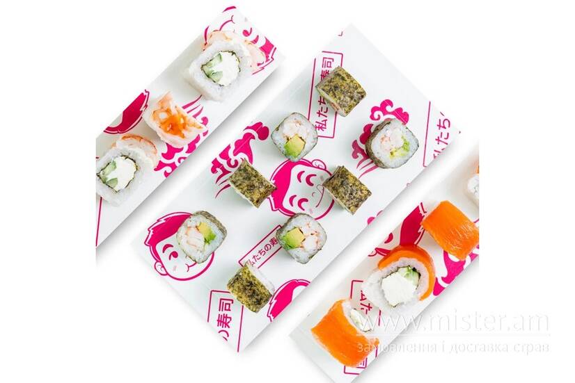 Філадельфія з лососем (0,5 рола), Філадельфія з креветками (0,5 рола), макі рол з креветками та авокадо. 16 шт.
