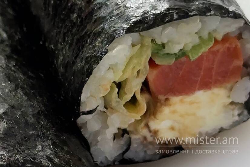 Рис, соус спайс, соус унагі, лосось копчений фурікаке, крем-сир, огірок, айсберг.