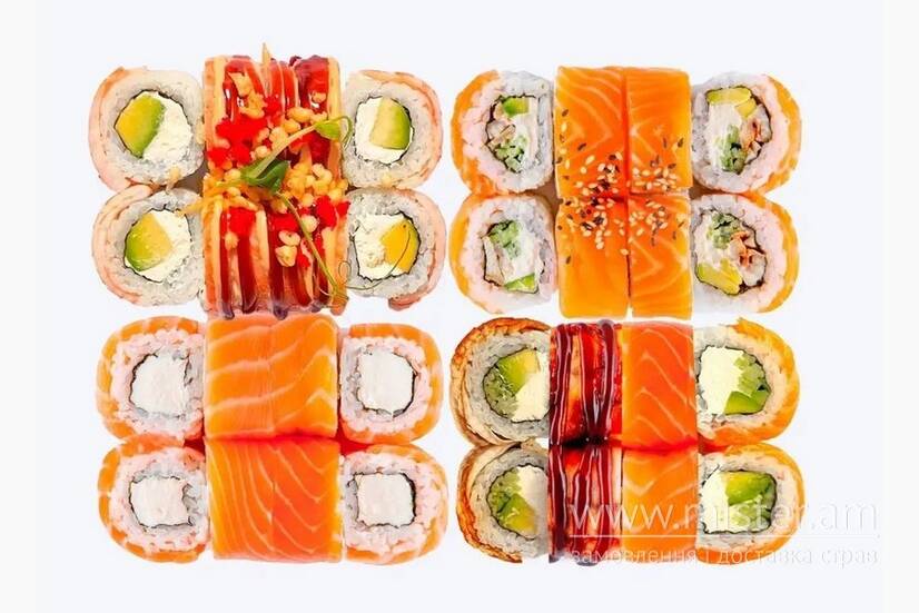 Філа Супер класична, Філа з лососем та вугрем, Філа Преміум з креветкою, Філадельфія Мікс вугор та лосось. 32 шт.