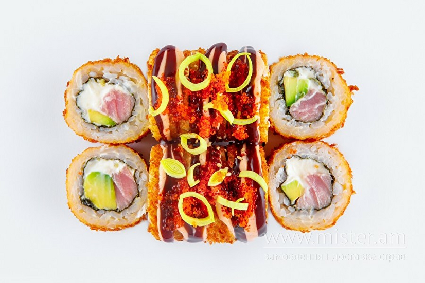 Рис, норі, тунець, сир Філадельфія, авокадо, цибуля порей, ікра тобіко, темпура, соус спайс, соус унагі. 10 шт.