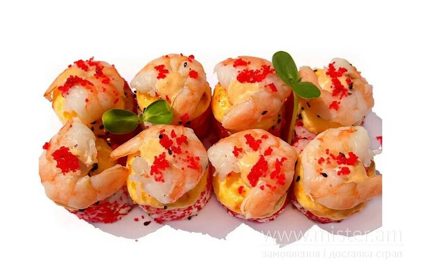 Креветки, сніжний краб, сир Філадельфія, японський омлет, авокадо, ікра тобіко, сир гауда, японський майонез, рис, імбир, васабі, соєвий соус.