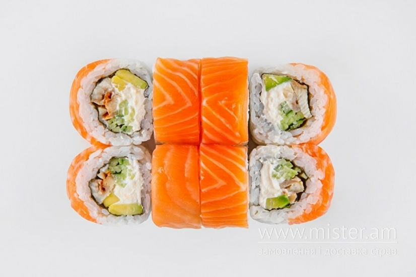 Рис, норі, лосось, вугор, сир Філадельфія, авокадо, огірок, соус унагі, імбир, васабі, соєвий соус. 8 шт.