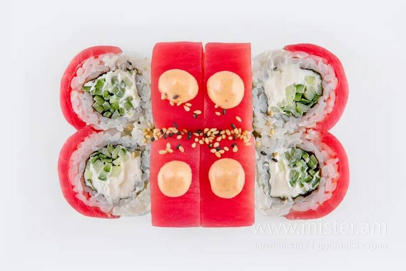 Рис, норі, тунець, сир Філадельфія, огірок, соус спайс, імбир, васабі, соєвий соус.