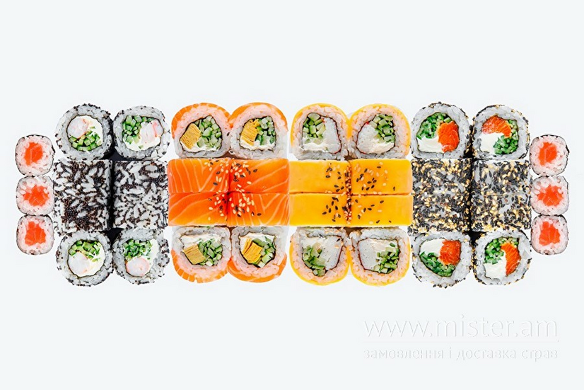 Філадельфія в ікрі з креветкою, Філадельфія в кунжуті з лососем, Червоний дракон, Чіз рол зі сніжним крабом, Макі лосось. 38 шт.