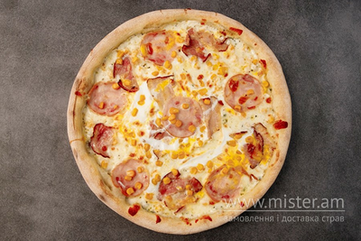 Білий соус, моцарела, шинка, бекон, яйце, кукурудза.