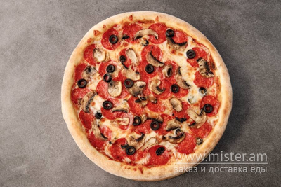 Томатний соус «Пілатті», моцарела, пепероні, гриби, маслини.