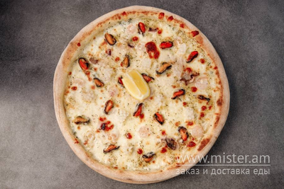 Білий соус, моцарела, кальмар, мідії, восьминіг, креветки, лимон.