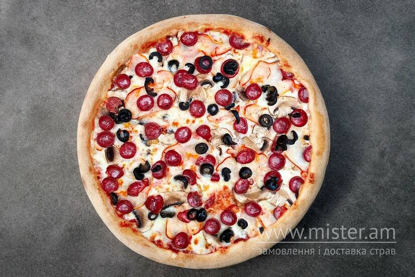Червоний соус, моцарела, мисливські ковбаски, копчена курочка, гриби, маслини.