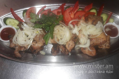 Свиний балик,по-грузинськи, св. філе, помідор, огірок, перець, зелень, цибуля, соус шашличний.