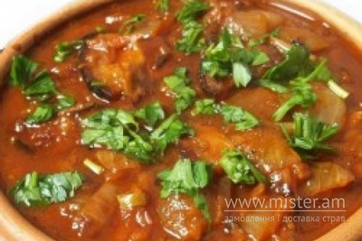 Свинина, помідор, цибуля ріпчаста, зелень, спеції, томат, олія, часник.