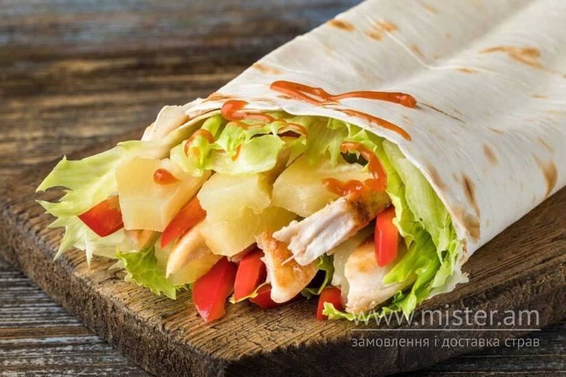 Вірменський лаваш, куряче філе, ананас, сир, авторський соус.