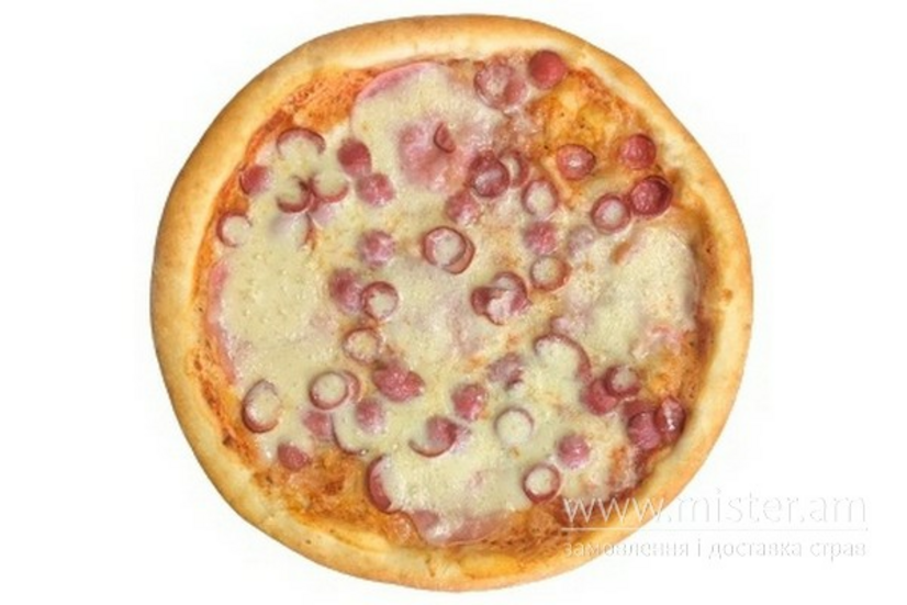 Соус червоний, сир моцарела, шинка, мисливські ковбаски, помідор.