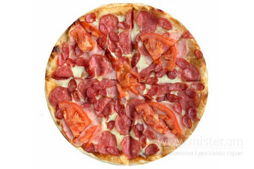 Соус барбекю, моцарелла, цибуля маринована, бекон, мисливські ковбаски, помідори.
