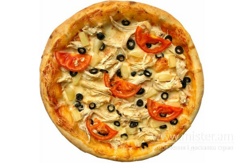 Соус томатний, моцарелла, куряче філе, ананас, маслини,помідор.