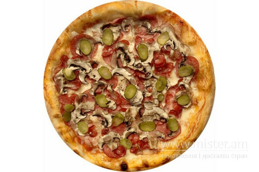 Соус гострий, моцарелла, бекон, салямі, гриби, мисливські ковбаски, цибуля маринована, помідор, огірок.