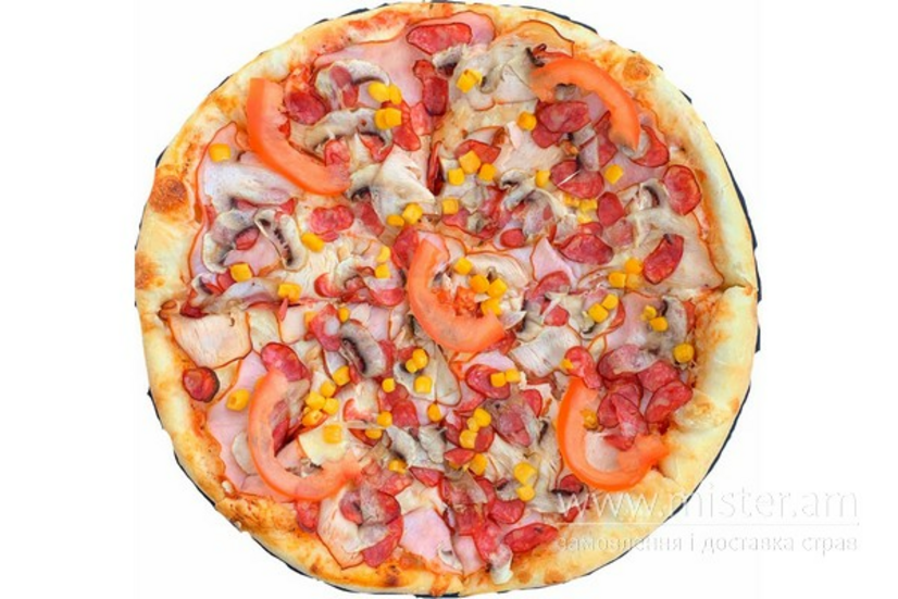 Соус томатний, моцарелла, балик, мисливські ковбаски, кукурудза, цибуля маринована, гриби, помідор.