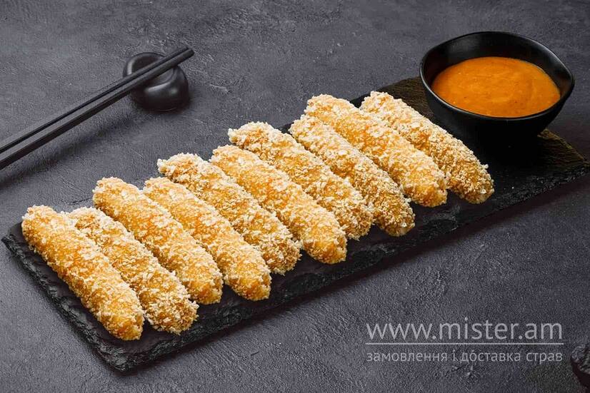 Куряче філе, яйце, панірувальні сухарі, борошно темпура, сіль, перець, соус горіховий (гострий).