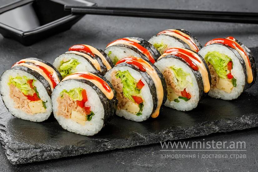 Рис, тунець консервований, салат айсберг, перець болгарський, цибуля зелена, омлет, кляр темпура, соус світ чилі, норі.