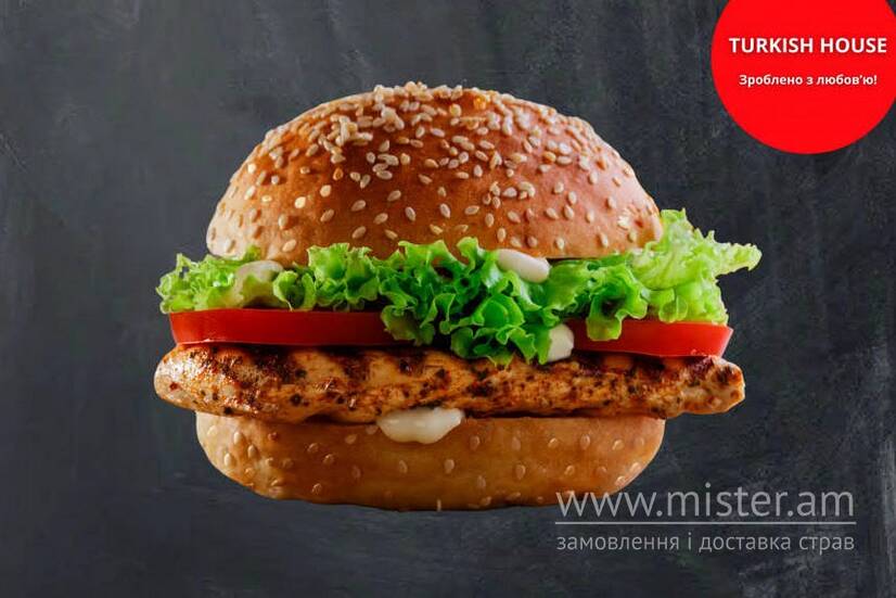 Булка, котлета куряча, лист салату, сир, цибуля маринована, огірок солоний, томати, соус бургерний.