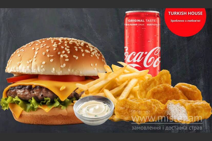 Бургер курячий/телячий (на вибір), картопля фрі, нагетси, соус на вибір, напій.