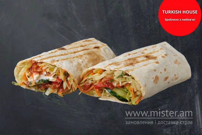 Лаваш, капуста, морква по-корейськи, томати, огірок солоний, картопля, фірмовий соус.