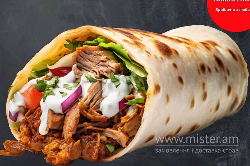 Лаваш, курка, капуста, морква по-корейськи, томати, огірок солоний, картопля, фірмовий соус.