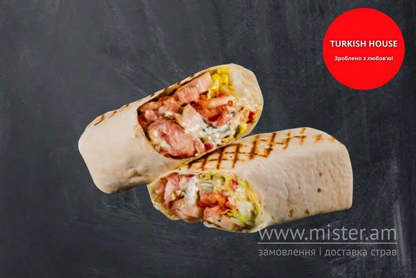 Лаваш, морква по-корейськи, копчена курка, томати, капуста, огірок солоний, фірмовий соус, кукурудза, ананаси.