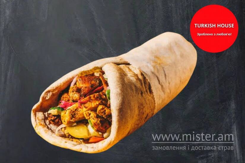 Лаваш, курячий шашлик, томати, огірок солоний, картопля, фірмовий соус.