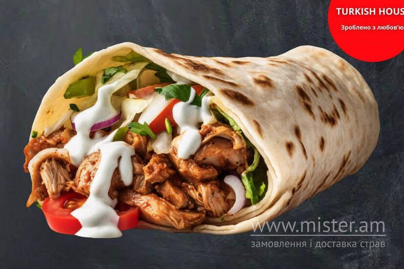 Лаваш, курка, капуста, морква по-корейськи, томати, огірок солоний, картопля, фірмовий соус.