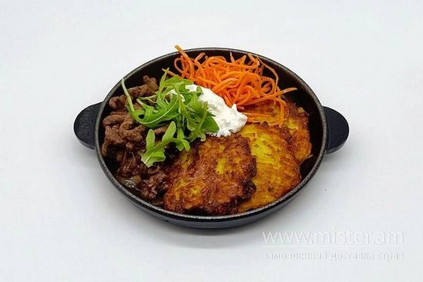 Деруни з картоплі, телятина, крем з фети, морква по-корейськи обсмажена у фритюрі.