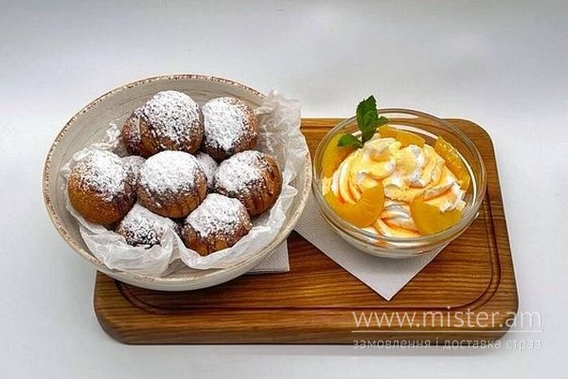 Солодкі пончики з творожного тіста смажені у фритюрі, политі карамельним сиропом, подаються зі взбитими вершками та персиком.