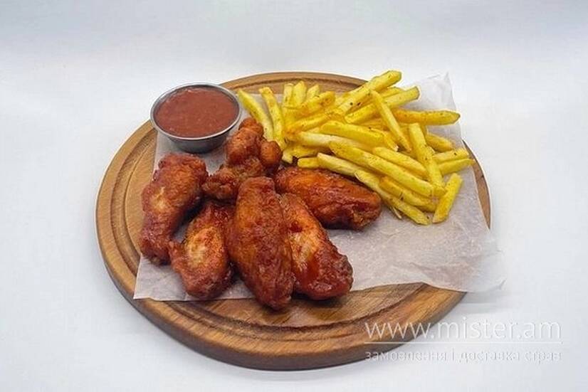 Курячі крильця паніровані в борошні, обсмажені у фритюрі та подані в соусі “Бафало”. Подаються з картоплею фрі та соусом BBQ.