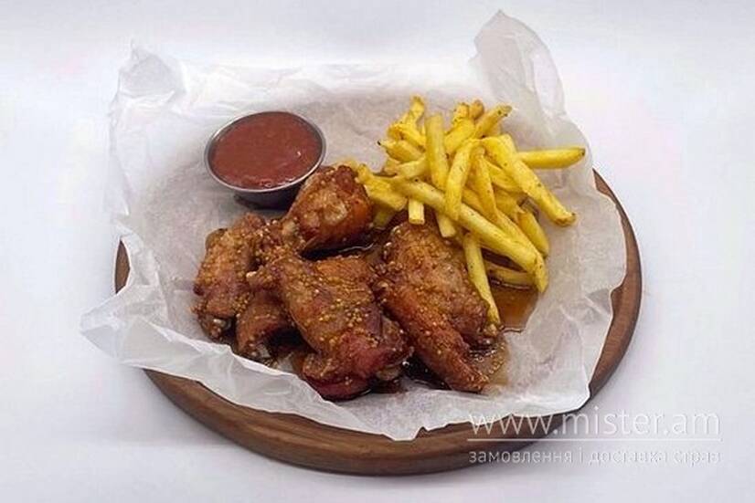 Курячі крильця обсмажені у фритюрі та подані в медово-гірчичному соусі. Подаються з картоплею фрі та соусом BBQ.