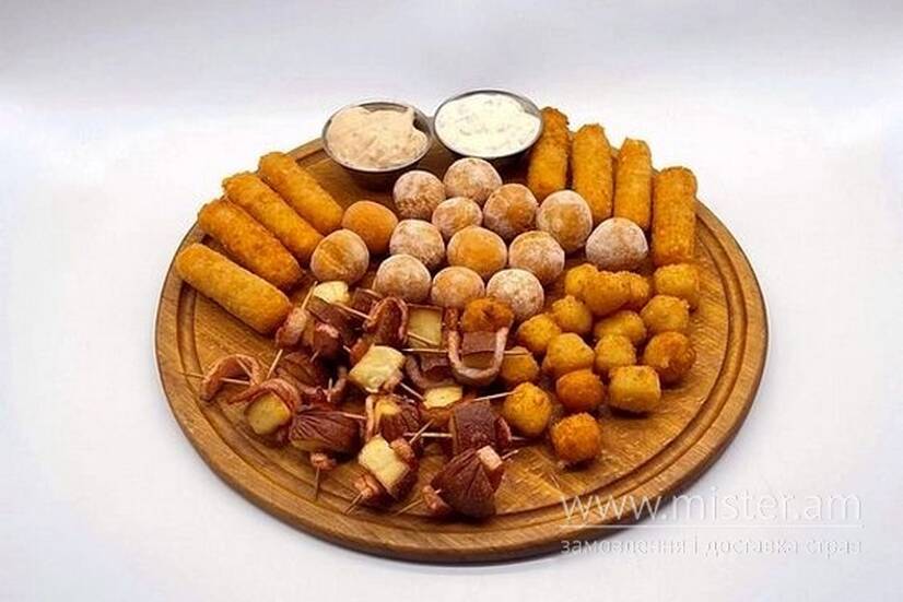 Сирні палички, сирні кубики, сирні кулі, сир в беконі, 2 соуси.