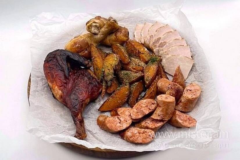 Пів курча в соусі BBQ, дублінські ніжки, ковбаска домашня, балик копчений, картопля печена.