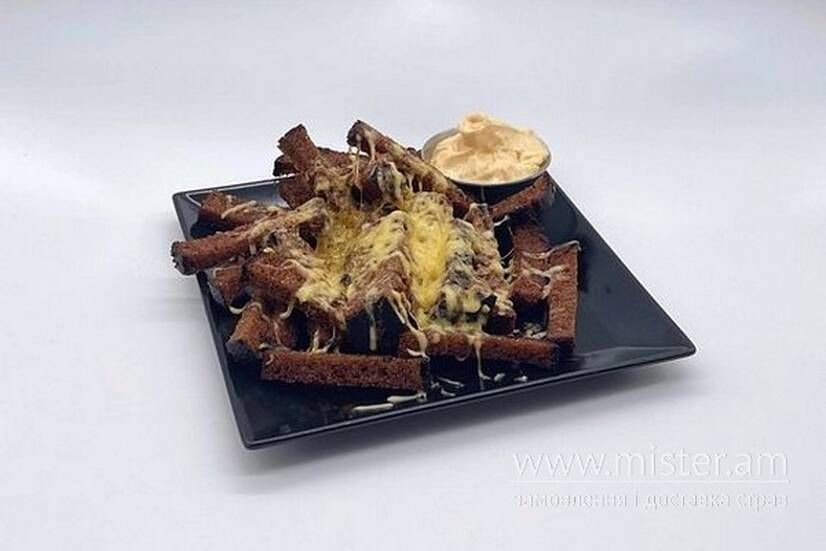 Обсмажені грінки з ржаного хліба з сиром, соусом, часником та спеціями. Подаються з соусом.